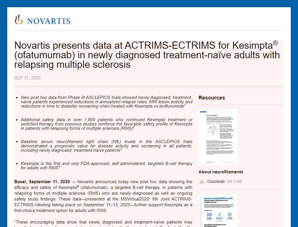 Novartis Presents Data At Actrims Ectrims For Kesimpta Ofatumumab In Newly Diagnosed Treatment Naive Adults With Relapsing Multiple Sclerosis Boerse De